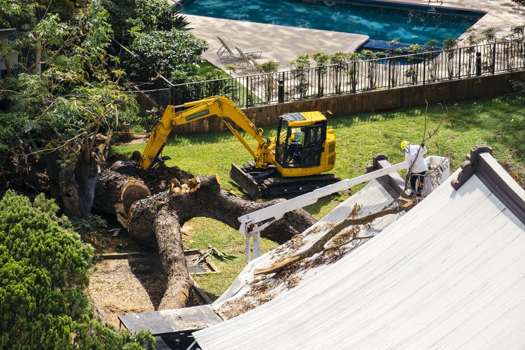 TIME: WEDNESDAY, 9:13 A.M. LOCATION: NU‘UANU, O‘AHU PHOTOGRAPHER: AARON K. YOSHINO A crew from H.T.M. Contractors removes a huge monkeypod branch from the Honolulu Myohoji Mission in Nu‘uanu. The branch fell on the roof in April and was an “emergency…