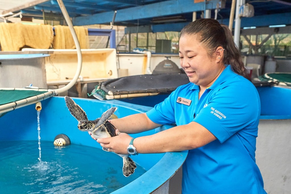 Head Aquarist Nadine Nagata weighs a seven-month-old Hawaiian green sea turtle, part of a routine analysis of the animal’s development. Maui Ocean Center’s turtles come from Sea Life Park Hawaii where they are bred by a colony of turtles that…
