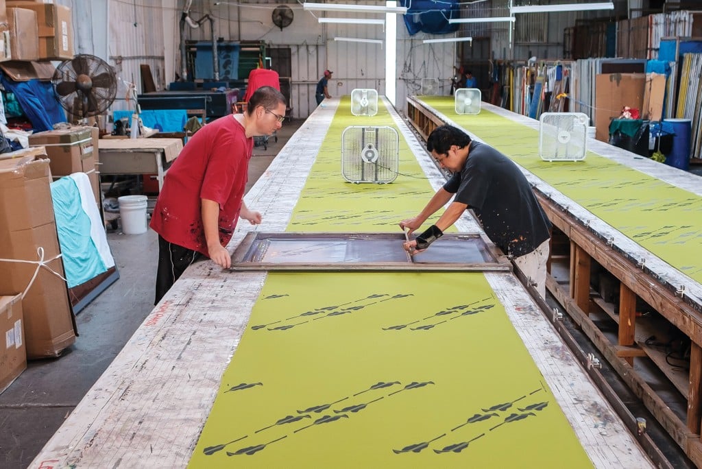 Allen Wall, left, and Arian Yee squeegee ink through a silk screen to apply a Sig Zane design called Ho‘olauki. It took two stages and about one hour to print one 30-yard piece of fabric, says Chris Yokogawa, the second-generation…