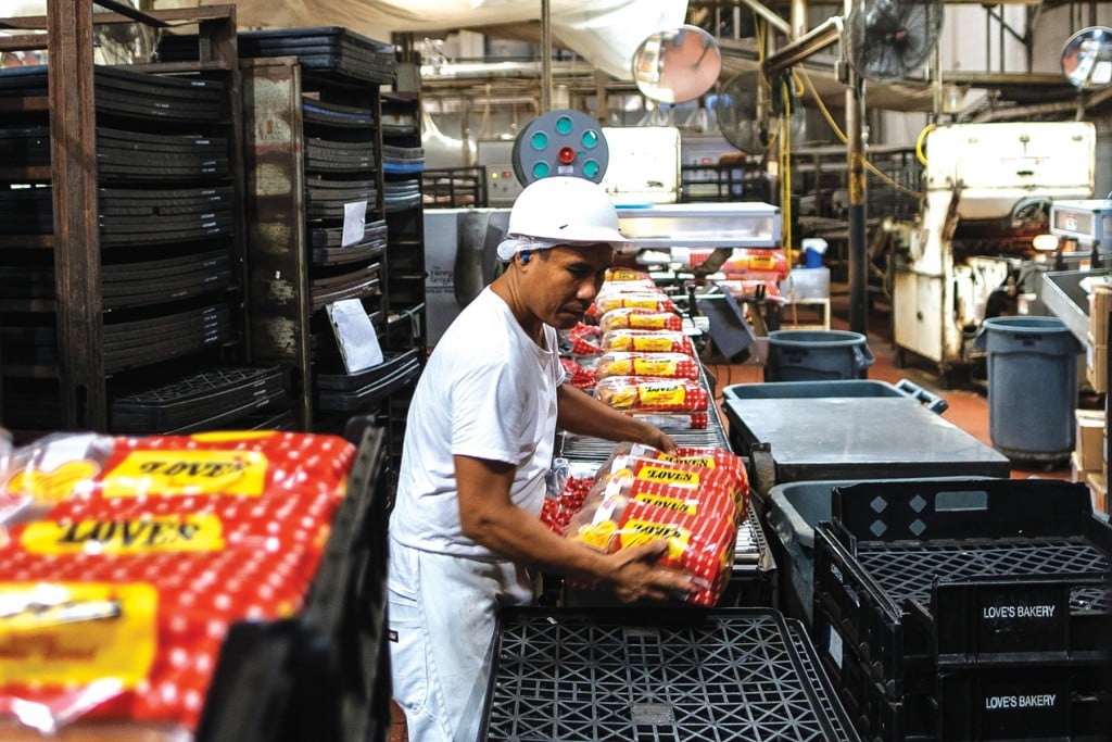 After automated slicing and bagging, a worker at Love’s Bakery fills trays with loaves that will be loaded on delivery trucks. The daily baking of breads, buns and doughnuts is spread over two shifts – 6 p.m. to 3 a.m.…