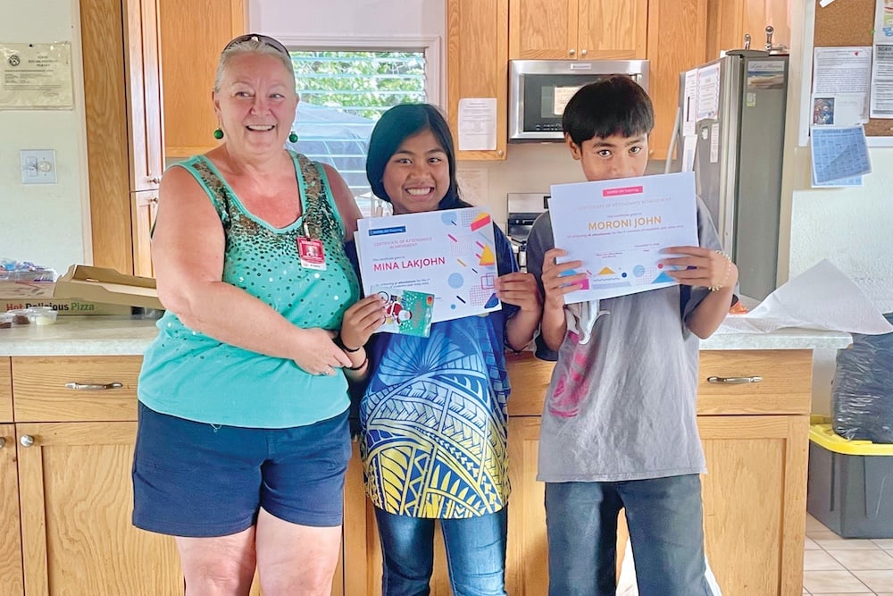 Tutor Lori Gibson with students Mina Lakjohn and Moroni John, who received $100 gift cards from the Rotary Club for being top attendees of the Ocean View afterschool tutoring program in the Ka‘u district of Hawai‘i Island. Graduation rates for the Marshallese students attending tutoring rose from 0% to 100% in a single year.