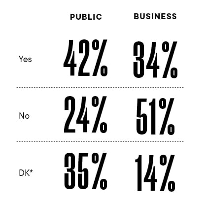 Business leaders and those members of the general public who are currently employed (322 of the 502 respondents) were asked if the company that employs them has a diversity and inclusion policy that focuses on hiring and promotions.