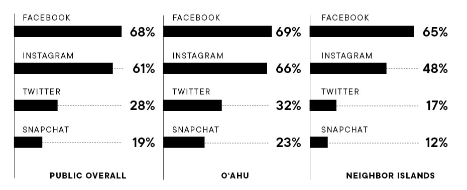 In the 808 Poll of the general public, 99% of the respondents said they had access to the internet. These people were asked which social media they logged onto at least four times a week.