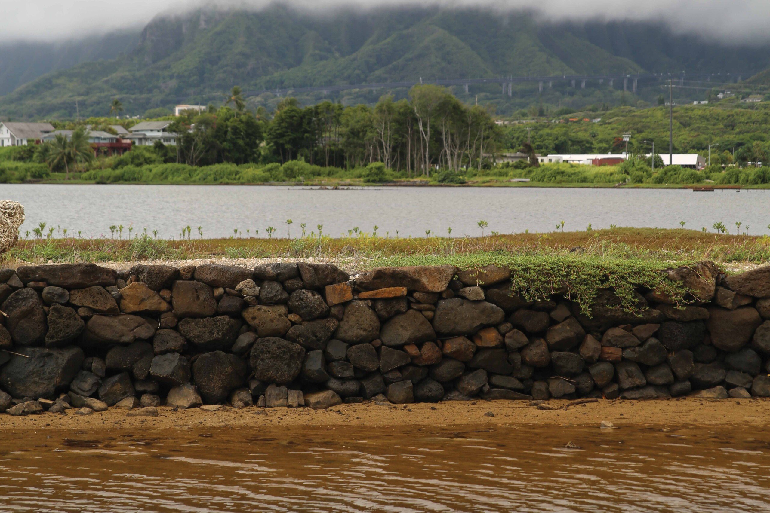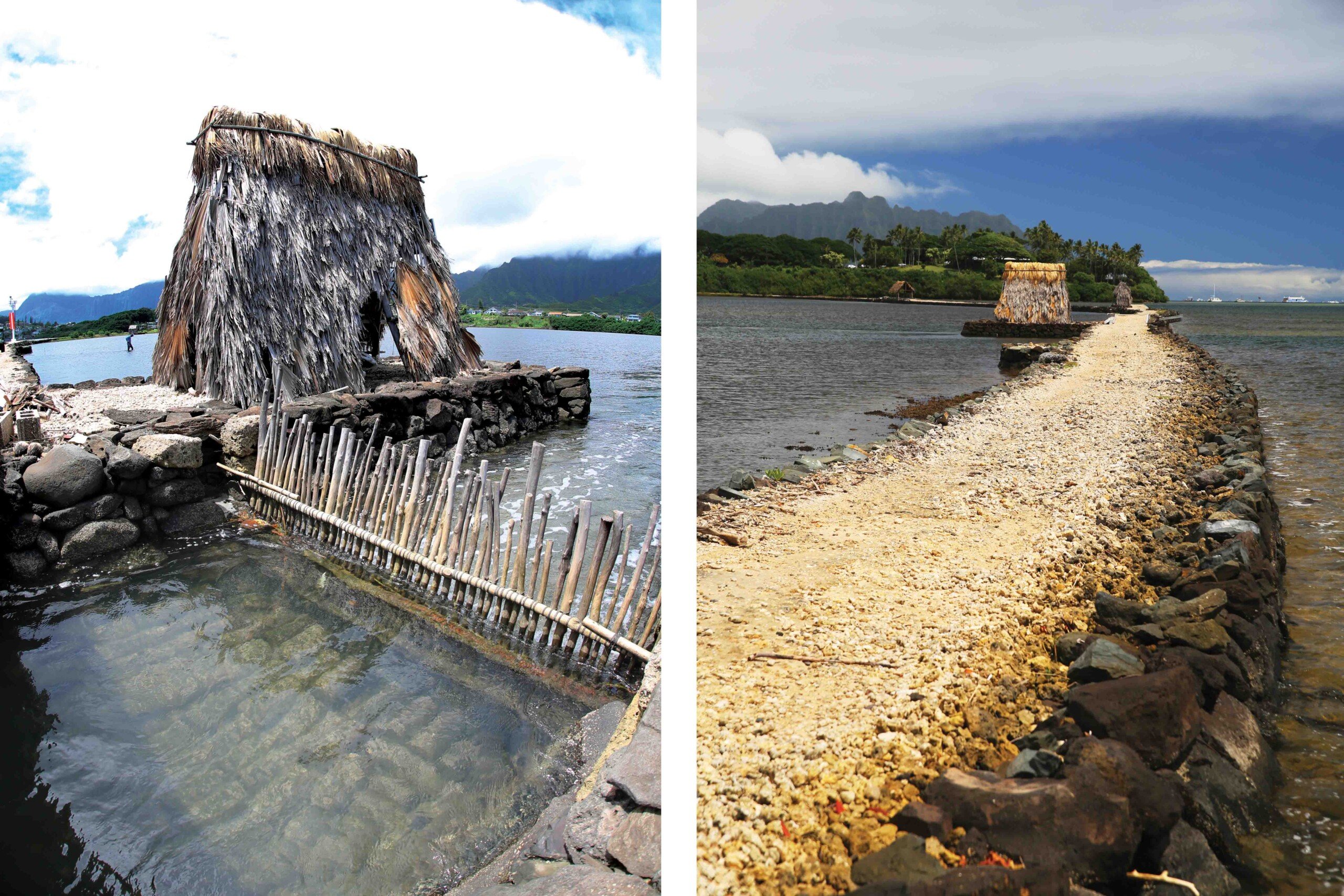 He‘eia Fishpond’s 1.3-mile wall is made of volcanic rock and coral and is 11 feet wide at the top. Interspersed along the wall are slatted gates, which allow small, young fish to enter the pond; those fish eventually grow so large they become trapped. The walls and gates also help maintain the right ratio of fresh water to salt water.