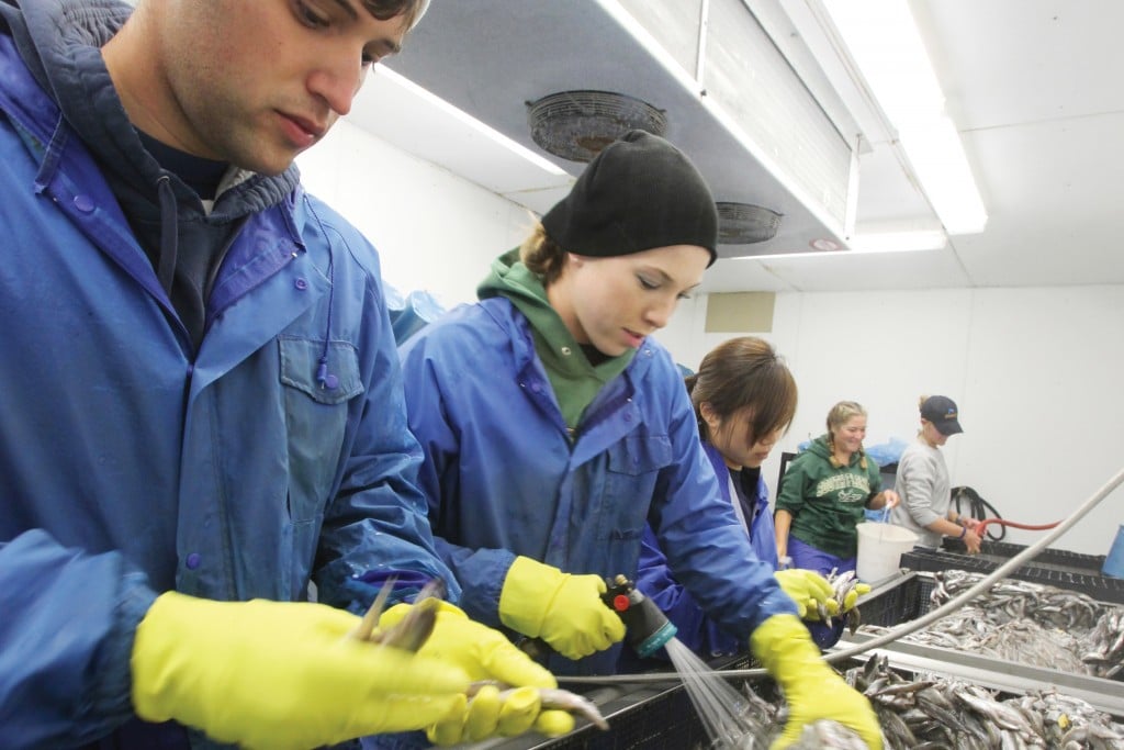 7:00 A.m., Friday Sea Life Park, Waimanalo >> Richard Coughlin, Danielle Holland, Amy Dickson, Stephanie Lawrence and Shanen Langowski break apart frozen capelin before feeding it to the animals living at Sea Life Park. Every day, the park processes about…