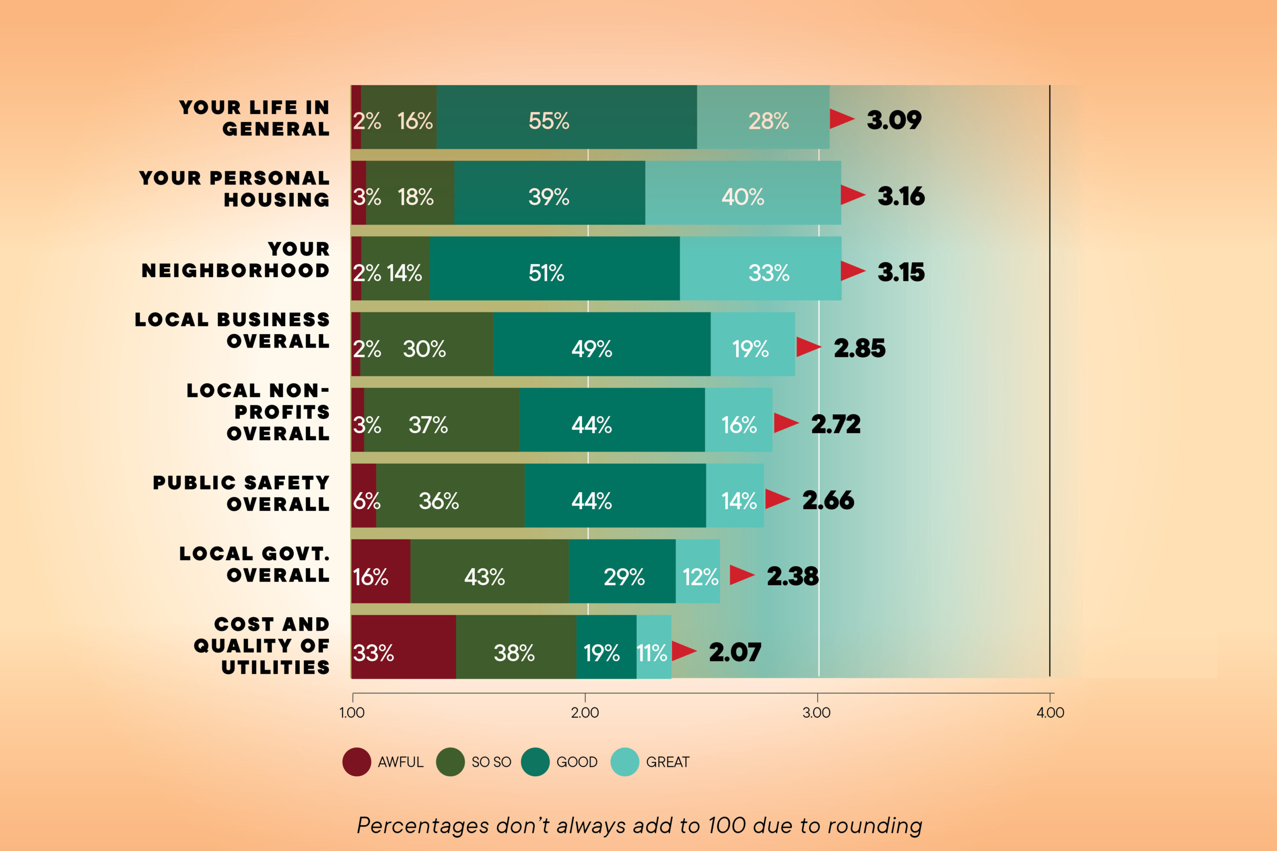 Each of the 410 respondents in the 808 Poll of the general public in Hawaiʻi was asked to rate aspects of their personal lives and their communities. In addition to the percentage results, an average score was also calculated. The higher the average score, the more positive the overall perception; 4.0 would be a perfect score and 1.0 is the lowest score possible.