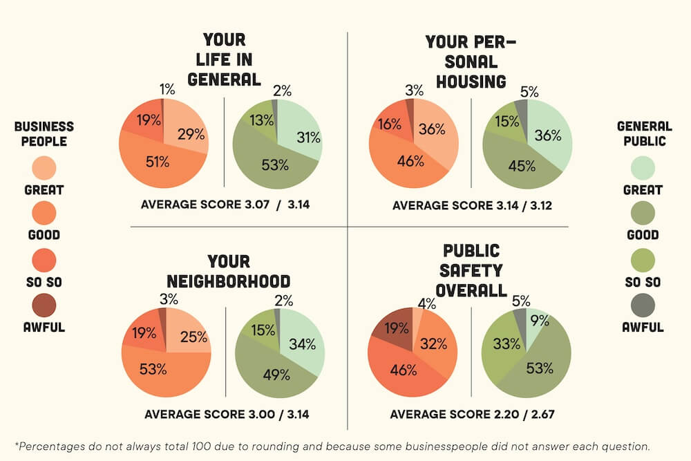 Each respondent was asked to rate aspects of their personal lives and communities using a four-point scale (“Great!” is 4 points and “Awful” is 1). An average score was also computed; the higher the average, the more positive the overall perception. The lowest possible score is 1.00. Percentages do not always total 100 due to rounding and because some businesspeople did not answer each question.