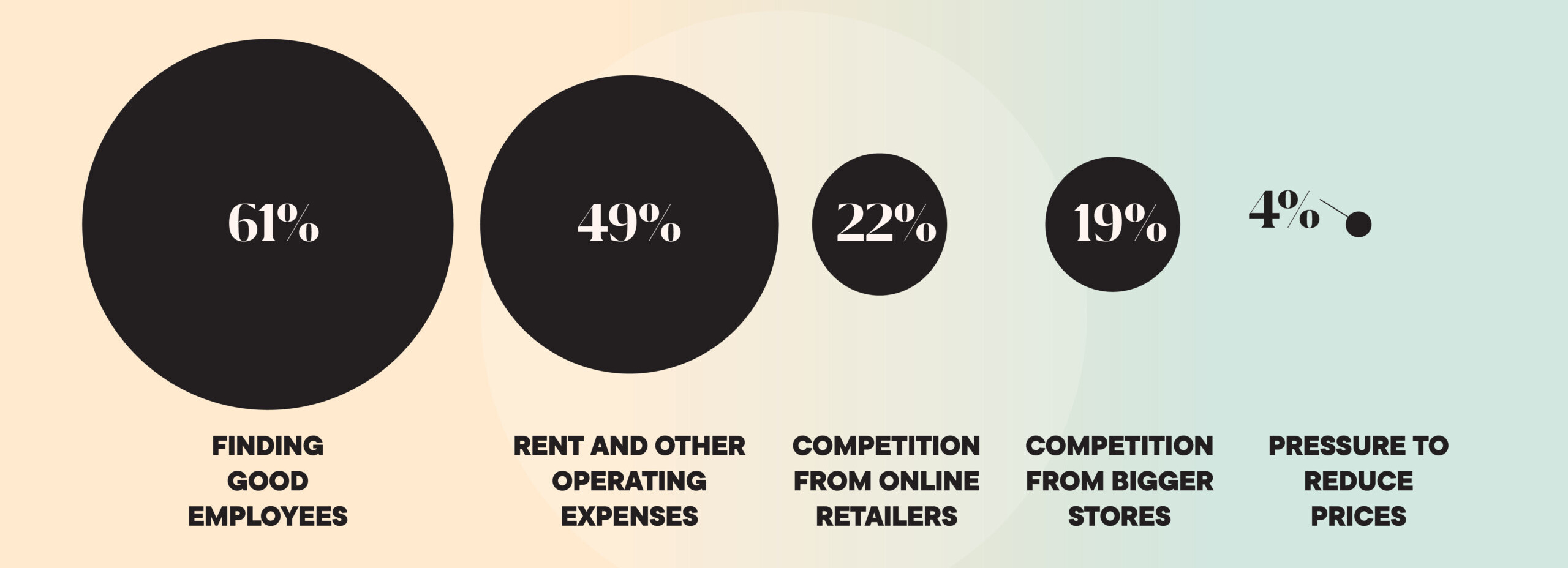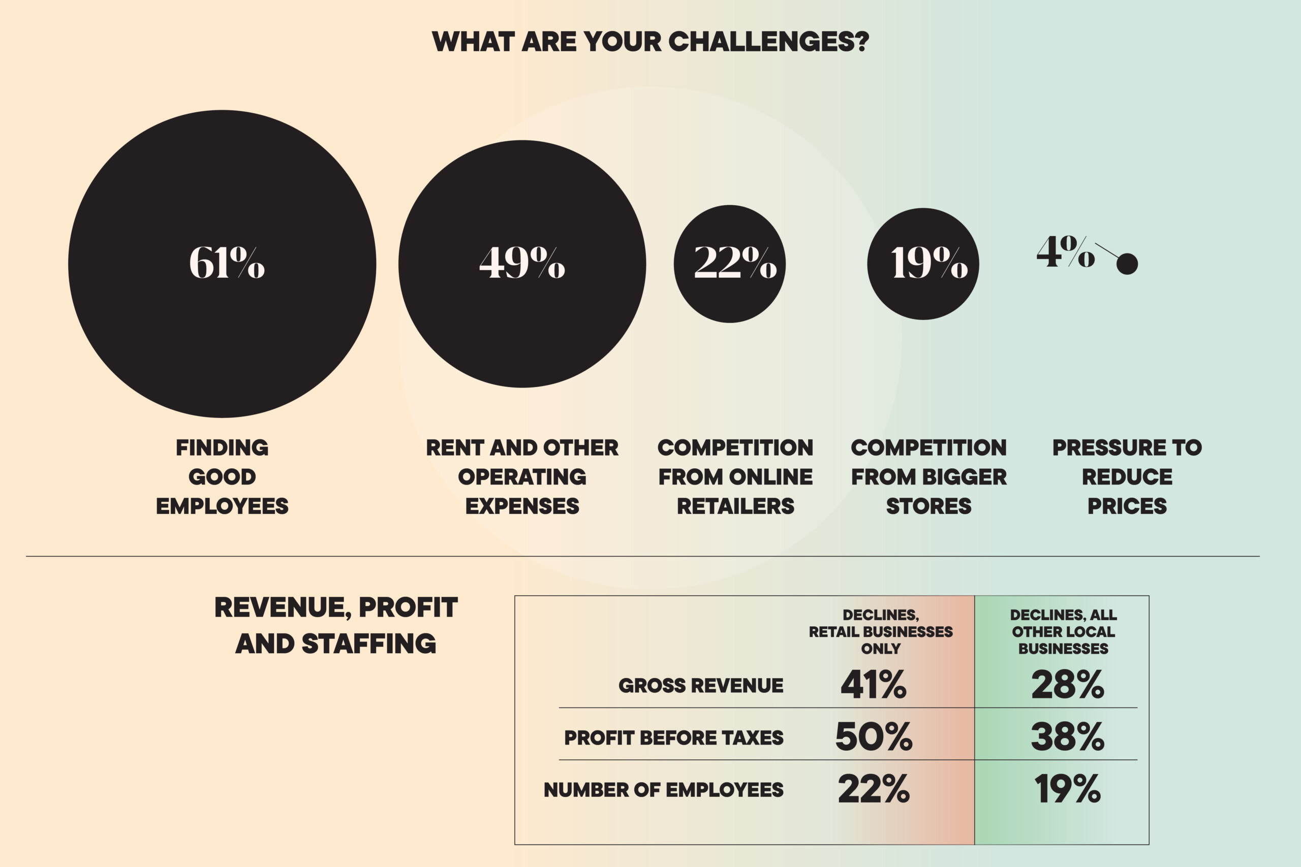 The top challenge for local retailers was, by far, finding good employees. In seven previous surveys of retailers, that challenge was never cited by more than 44% of retailers.