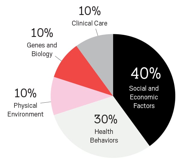 The single largest set of influences on a person’s health are social and economic factors. That means you can tell more about a person’s health by knowing their ZIP code than by knowing their genetics.