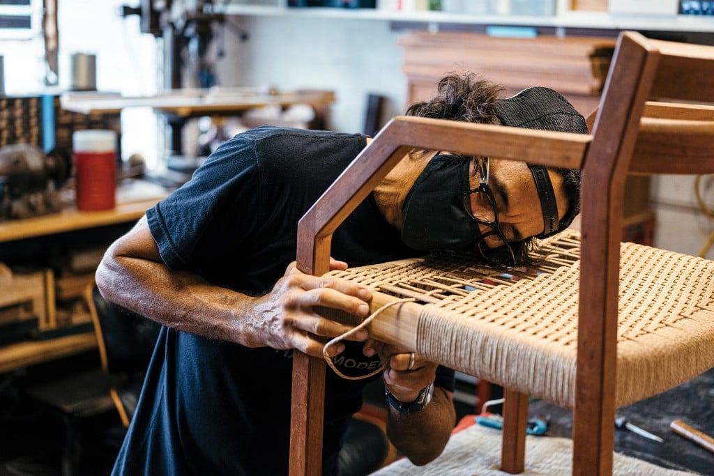 John Reyno re-weaves the seat using Danish paper cord on a 40-year-old Niels Møller dining chair, one of eight belonging to a client.