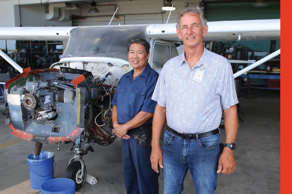 Instructors Mike Willett, right, and Brian Quinto lead the aeronautics maintenance technology program at Honolulu Community College’s airport location.| Photo: Jeff Sanner