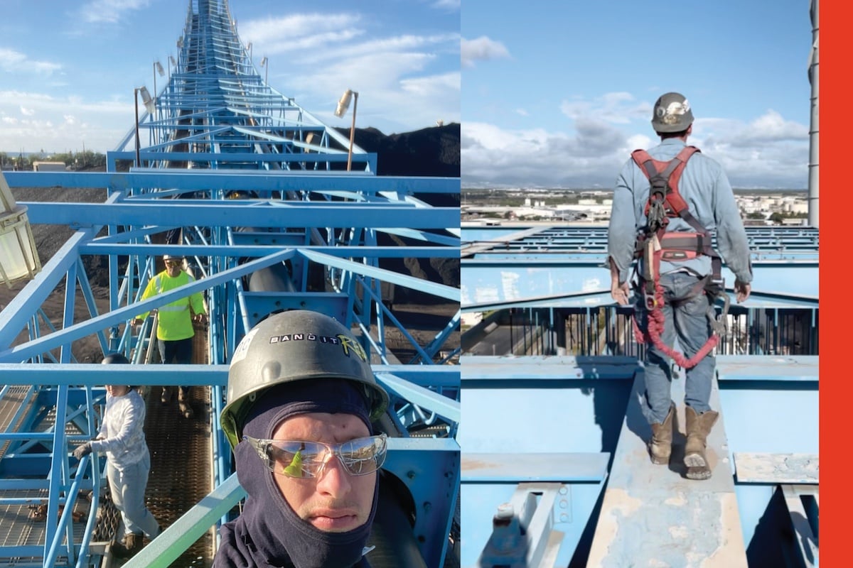 He sets the scene of his jobsite: “I’m wearing fire-resistant clothes and a head sock and gloves. I’m basically covered head to toe, with a hard hat that I change into welding headgear. And I’m two stories high,” welding in the blistering sun of Kapolei.