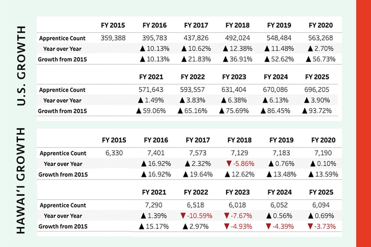 The past decade has seen a sharp increase in active registered apprenticeships nationwide, from 359,388 in 2015 to over 696,205 in 2025, according to data from the U.S. Department of Labor. Hawai‘i’s trend line is less robust, with a steep decline in apprenticeships in 2022, though those numbers have inched up in the past couple of years. In 2025, there are 6,094 active apprenticeships in the state, of which about 85% are in construction, 11% in manufacturing and the rest in a smattering of other industries.