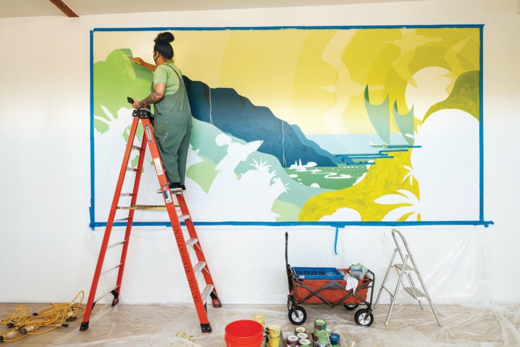 Local artist Shar Tuiasoa paints an indoor mural at the new dispensary in ‘Aiea for Noa Botanicals, a medical cannabis company. Tuiasoa’s mural tells the story of migration and the different ways in which plants, resources and people have migrated…